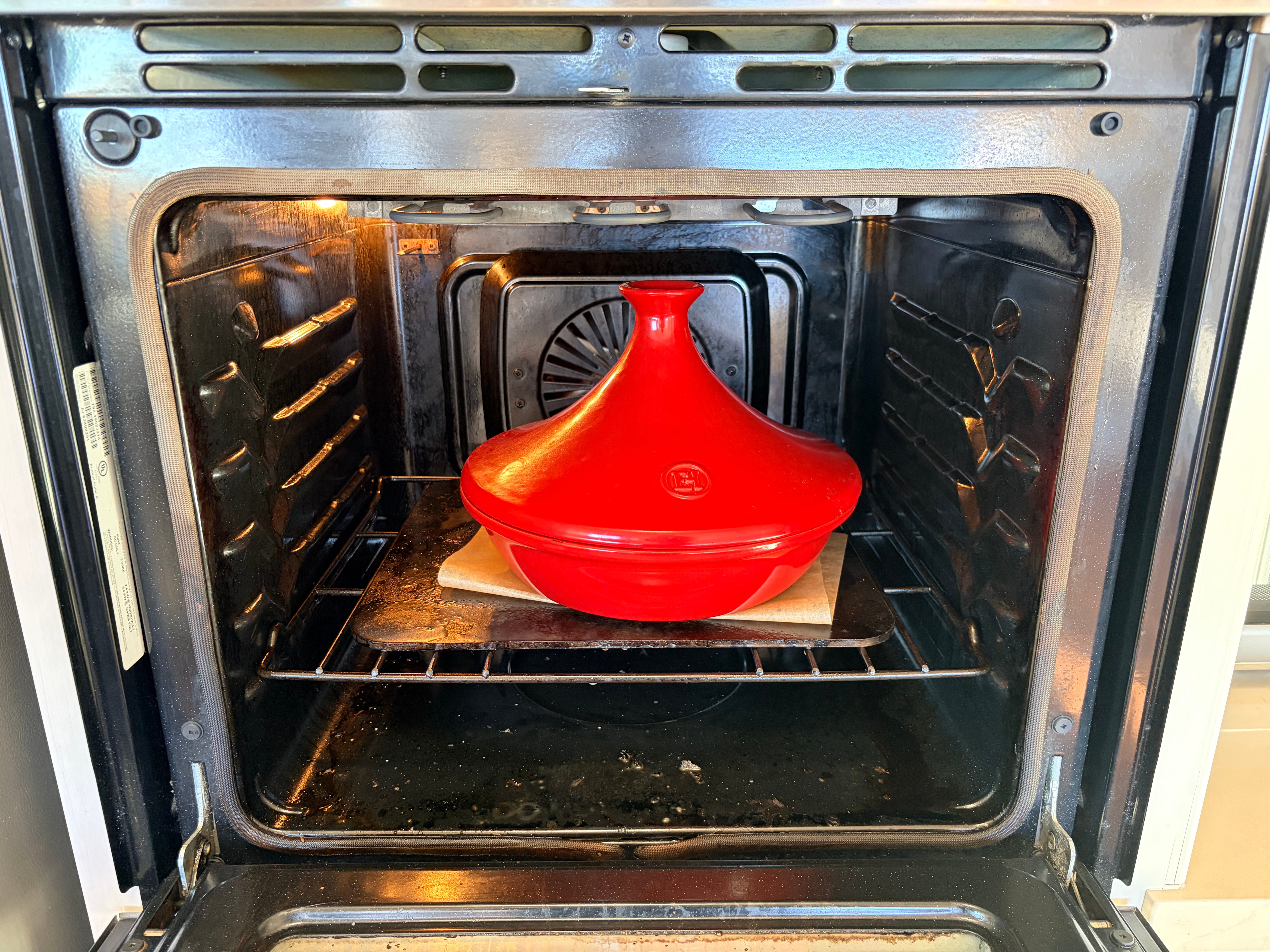 The tajine (I know, I’m spelling it both ways) has to warm in the oven. You don’t want to put hot liquids in a cold ceramic. Some use the tagine on a stove top - but I have an induction stove top, so ceramic won’t heat. But think about it - in North Africa, this is buried with coals around it. The best way to imitate that is with a nice warm oven.